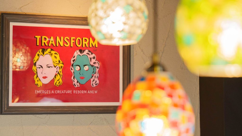 酒場の雰囲気を感じる遊び心のあるインテリアが、リラックスしたひとときを演出します。静かな時間を楽しむもよし、賑やかな会話を楽しむもよし、ご自由にお過ごしください。
